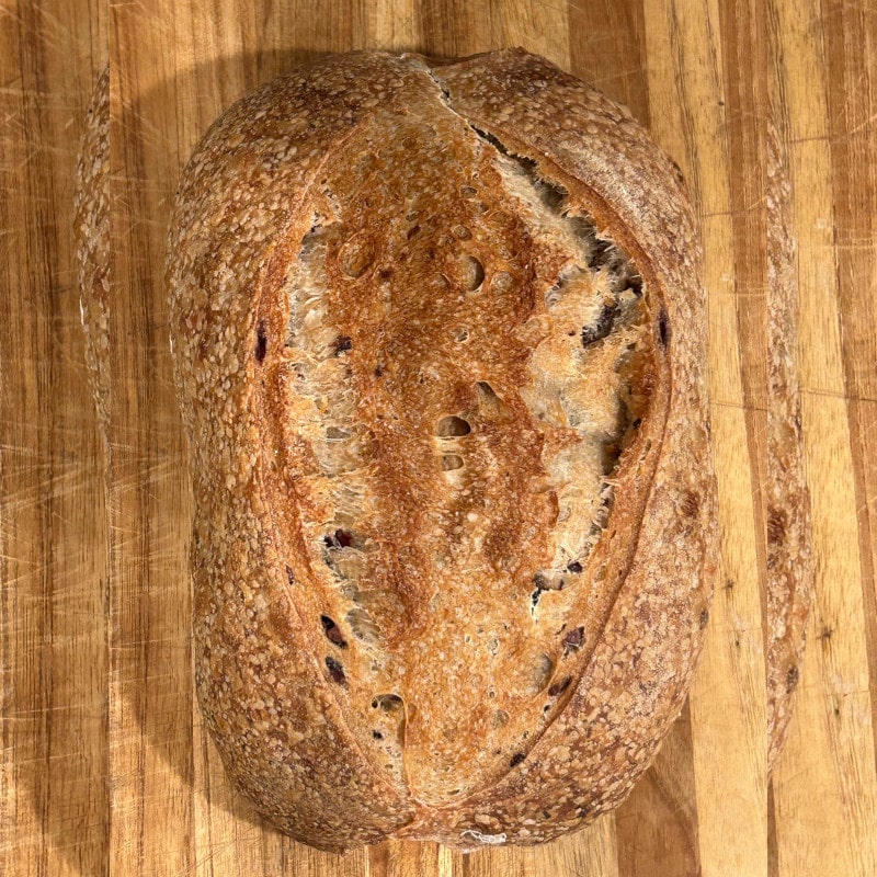 Made with sourdough and real kalamatta olives. No yeast used. Long fermentation. Deep flavor.